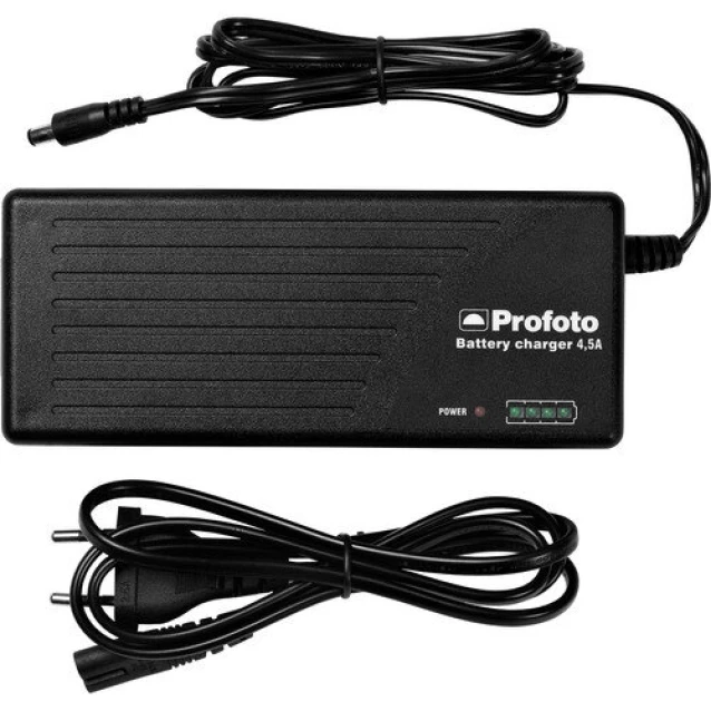 O Carregador Rápido de Bateria 4,5A para B1 500 AirTTL da Profoto carrega a bateria de íons de lítio do B1 em 1 hora. O carregador multivoltagem possui indicadores LED para monitorar facilmente o status da carga.
